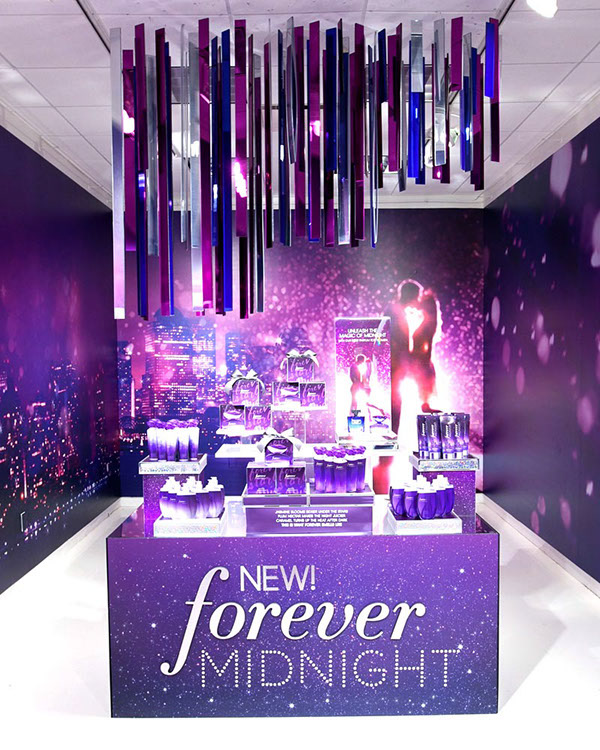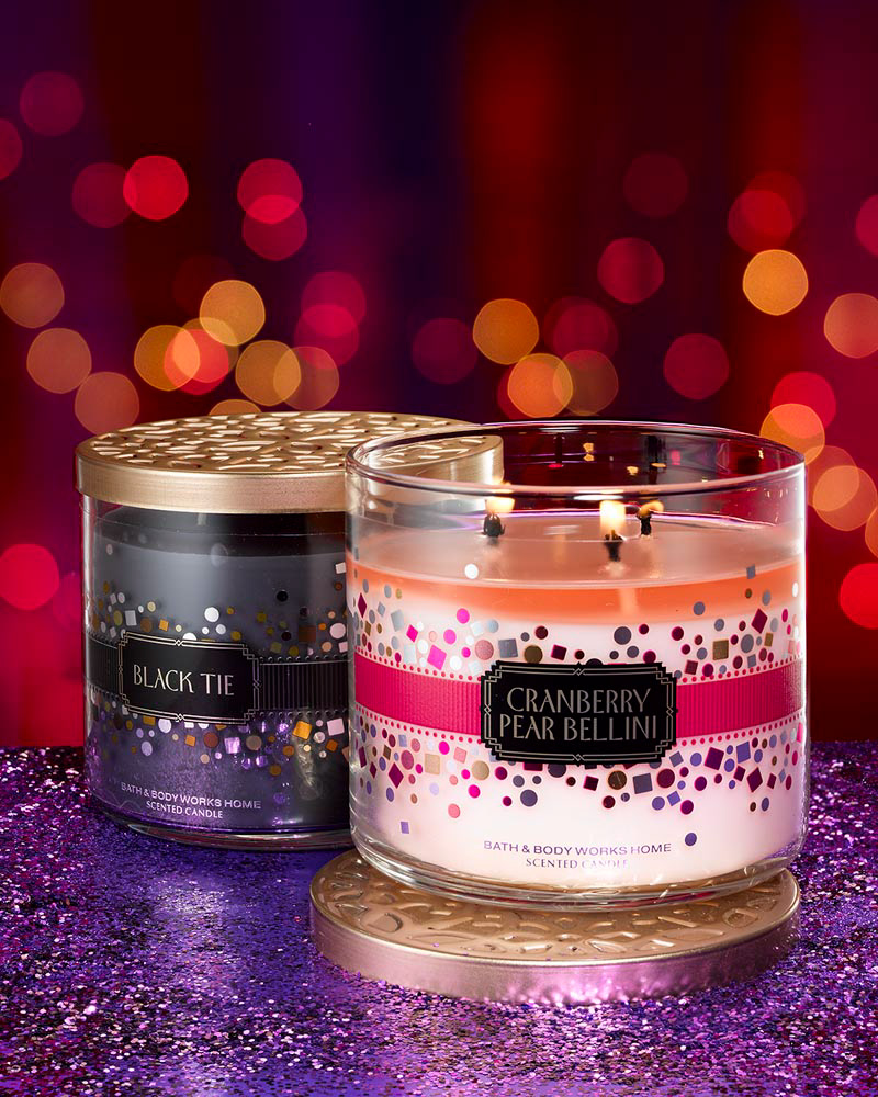 Product photography launching BBW's Forever Midnight fragrance and body care lines, and It Happened One Night home fragrance.